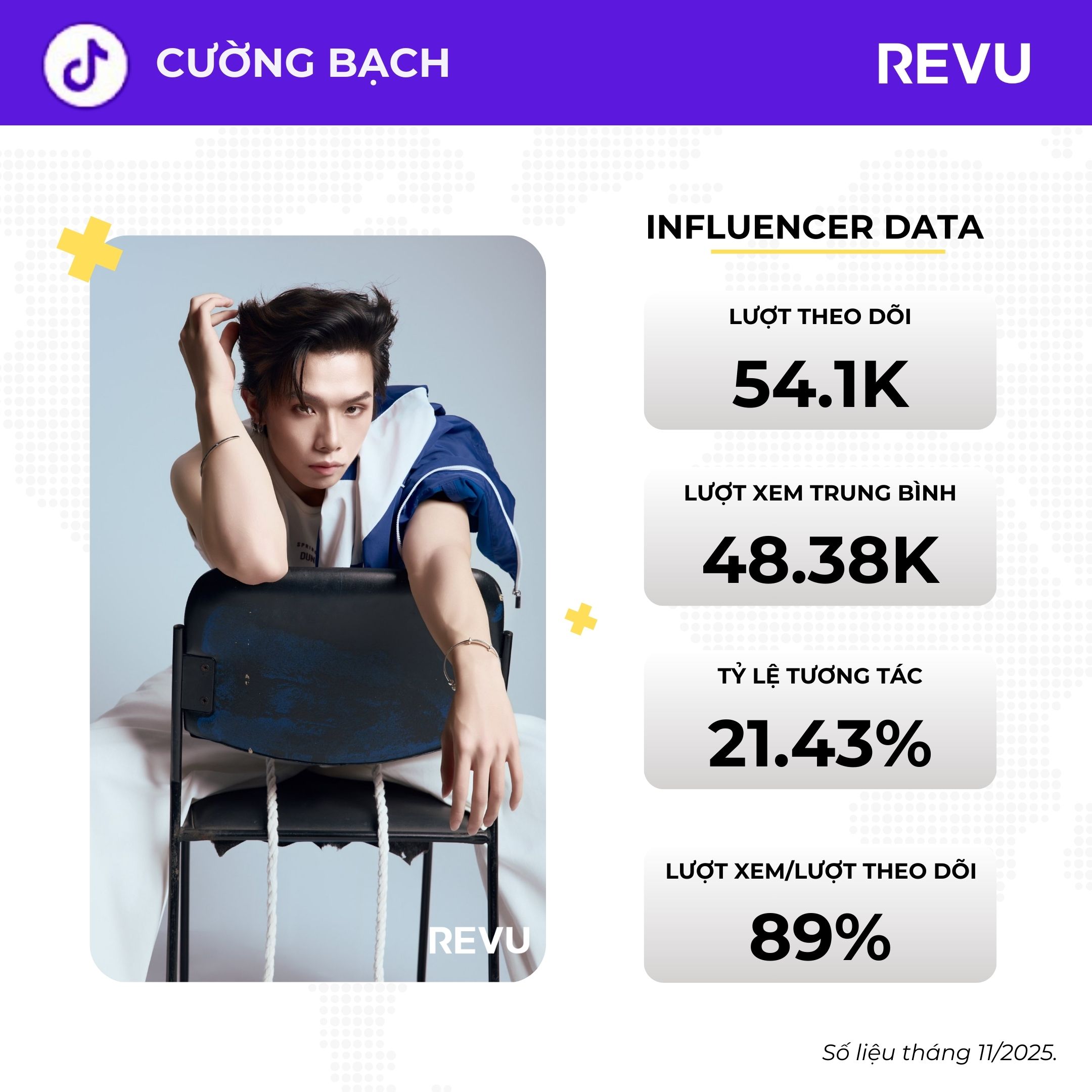 Dựa trên số liệu tháng 11/2025, kênh TikTok của Cường Bạch cho thấy sức tăng trưởng ổn định và đầy tiềm năng của một tân binh nổi bật. Với 54.1K người theo dõi, 48.38K lượt xem trung bình và tỷ lệ tương tác 21.43%, các nội dung của anh không chỉ tiếp cận đúng tệp fan mà còn dễ dàng vượt qua ngưỡng reach tự nhiên của follower. Đặc biệt, chỉ số 89% view/follow phản ánh khả năng viral mạnh mẽ, cho thấy video của Cường Bạch thường xuyên được thuật toán ưu ái nhờ mức độ tương tác tốt và sự hấp dẫn về mặt hình ảnh.