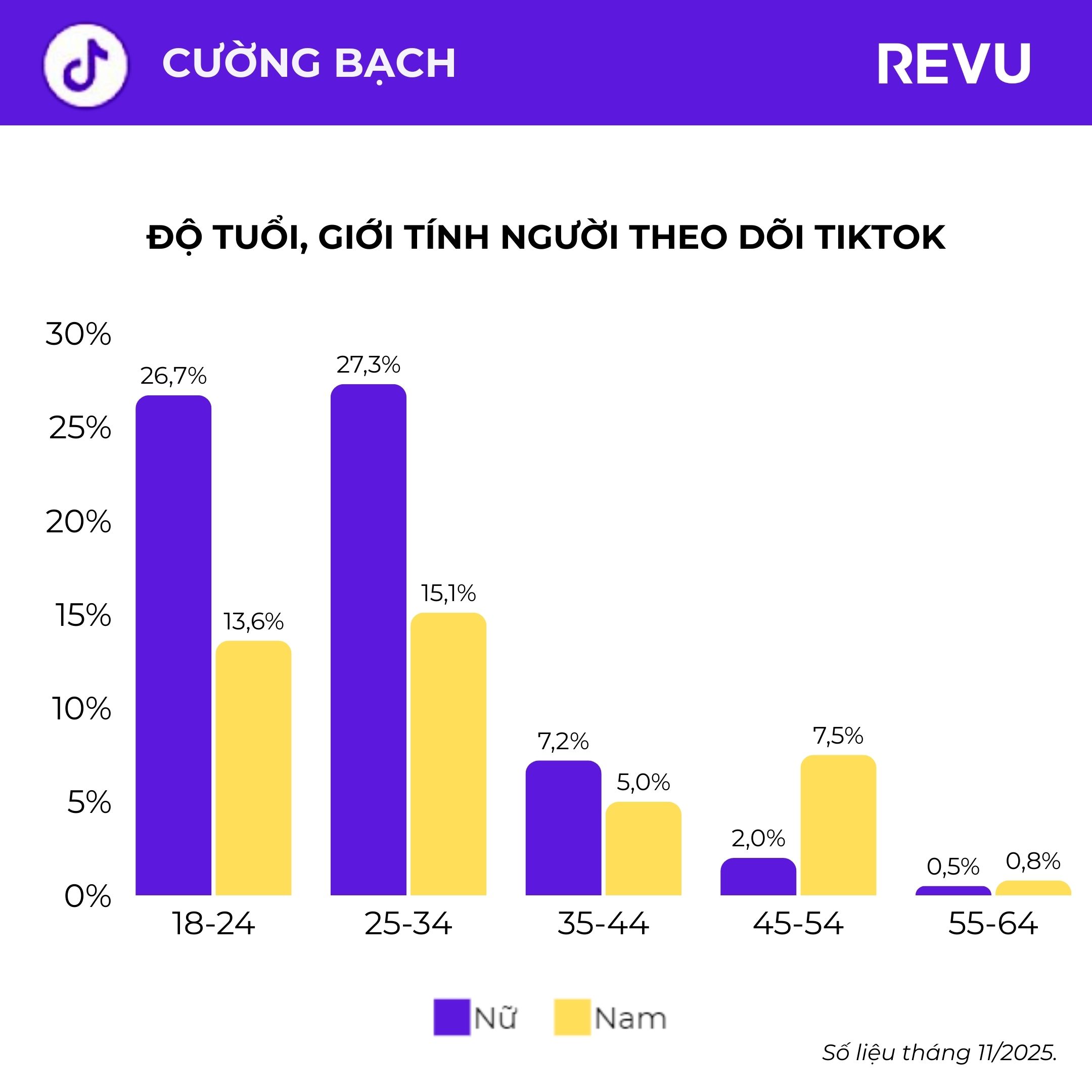 Về nhân khẩu học, tệp người theo dõi của Cường Bạch tập trung chủ yếu ở nhóm 18–34 tuổi, với tỷ lệ nữ chiếm ưu thế rõ rệt. Đây chính là nhóm khách hàng mục tiêu của nhiều ngành hàng thời trang, làm đẹp, lifestyle và F&B – những lĩnh vực luôn cần gương mặt trẻ, hiện đại và có sức ảnh hưởng trong cộng đồng TikTok. Sự cân bằng nhất định từ nhóm nam giới trong độ tuổi 25–34 cũng giúp anh phù hợp với nhiều chiến dịch mang tính trung tính, mạnh mẽ hoặc gắn với phong cách cá nhân.