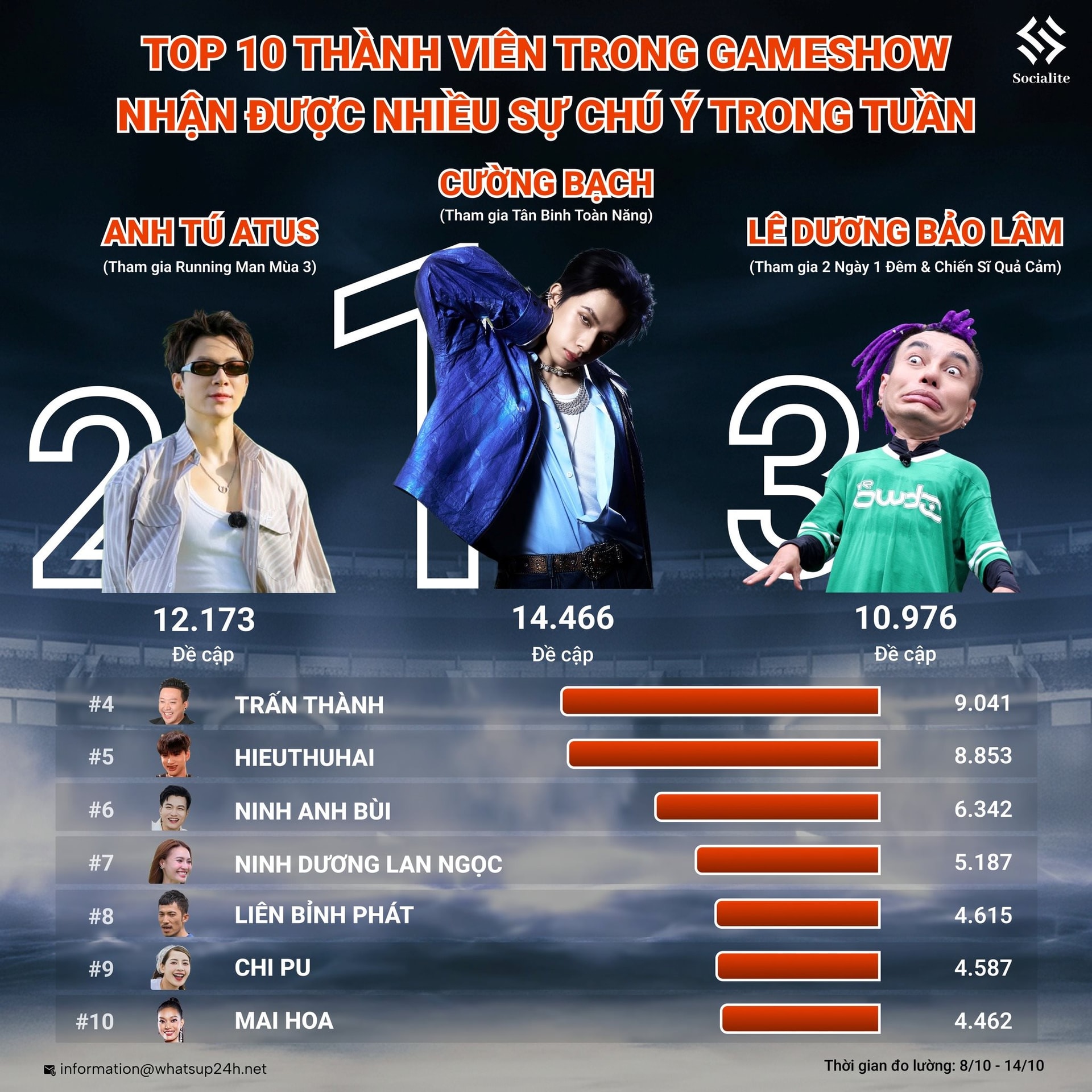 Không dừng lại ở đó, dựa trên số liệu từ Socialite, Cường Bạch đã vươn lên dẫn đầu BXH Top 10 thành viên được quan tâm nhất trong tuần, với 14.466 đề cập, vượt qua cả những nghệ sĩ có lượng fan đông đảo như Anh Tú Atus hay Lê Dương Bảo Lâm. Sự bứt phá này đến từ tài năng toàn diện, thần thái sân khấu nổi bật và hành trình 7 năm kiên trì theo đuổi ước mơ nghệ sĩ, biến anh trở thành nhân tố được quan tâm và kỳ vọng nhiều nhất tại Tân Binh Toàn Năng 2025.