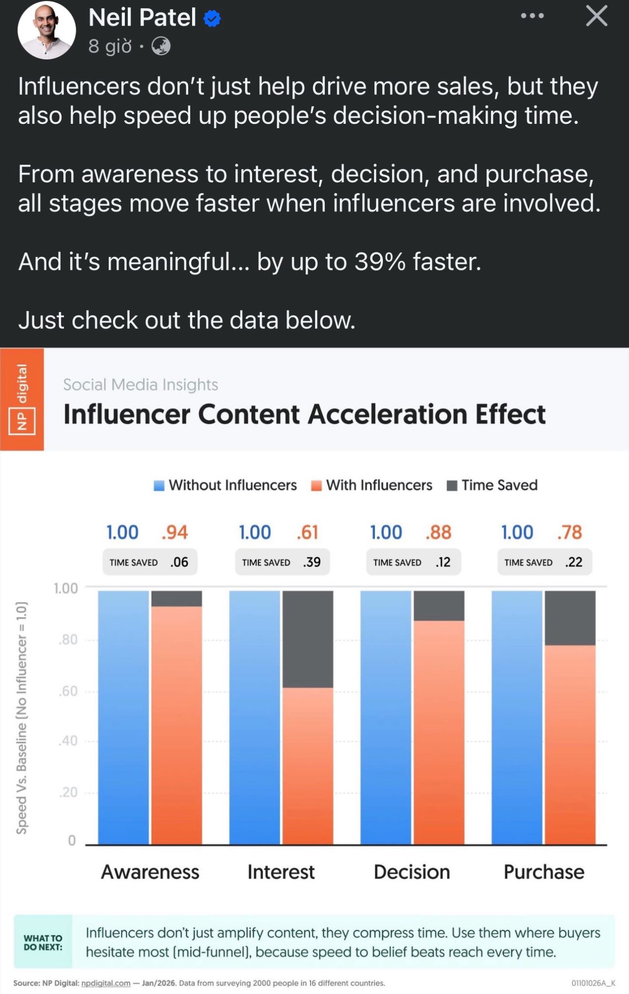Nhiều doanh nghiệp vẫn đang coi Influencer (người ảnh hưởng) chỉ là một kênh để “tăng nhận diện” (Awareness). Nhưng dữ liệu từ Neil Patel vừa chỉ ra một giá trị cốt lõi hơn nhiều: Sự nén thời gian (Time Compression).