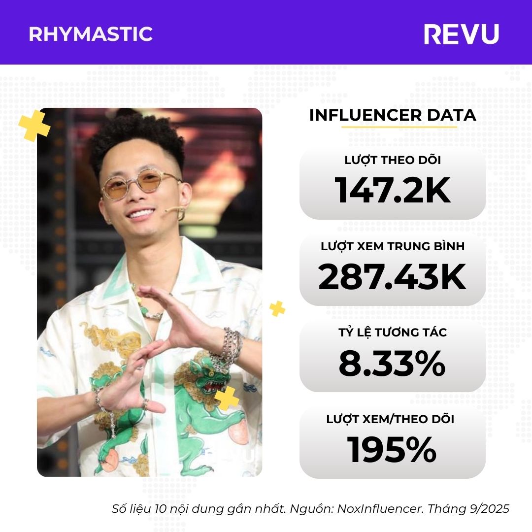 Dù lượng follower khiêm tốn hơn các nghệ sĩ khác, Rhymastic lại có khả năng truyền tải thông điệp chiều sâu, đặc biệt về kiến thức và cảm hứng sống. Anh phù hợp với các brand có chiến lược truyền thông chất lượng, không ồn ào nhưng bền bỉ, ví dụ như khóa học online, app học tiếng Anh, ngân hàng số…