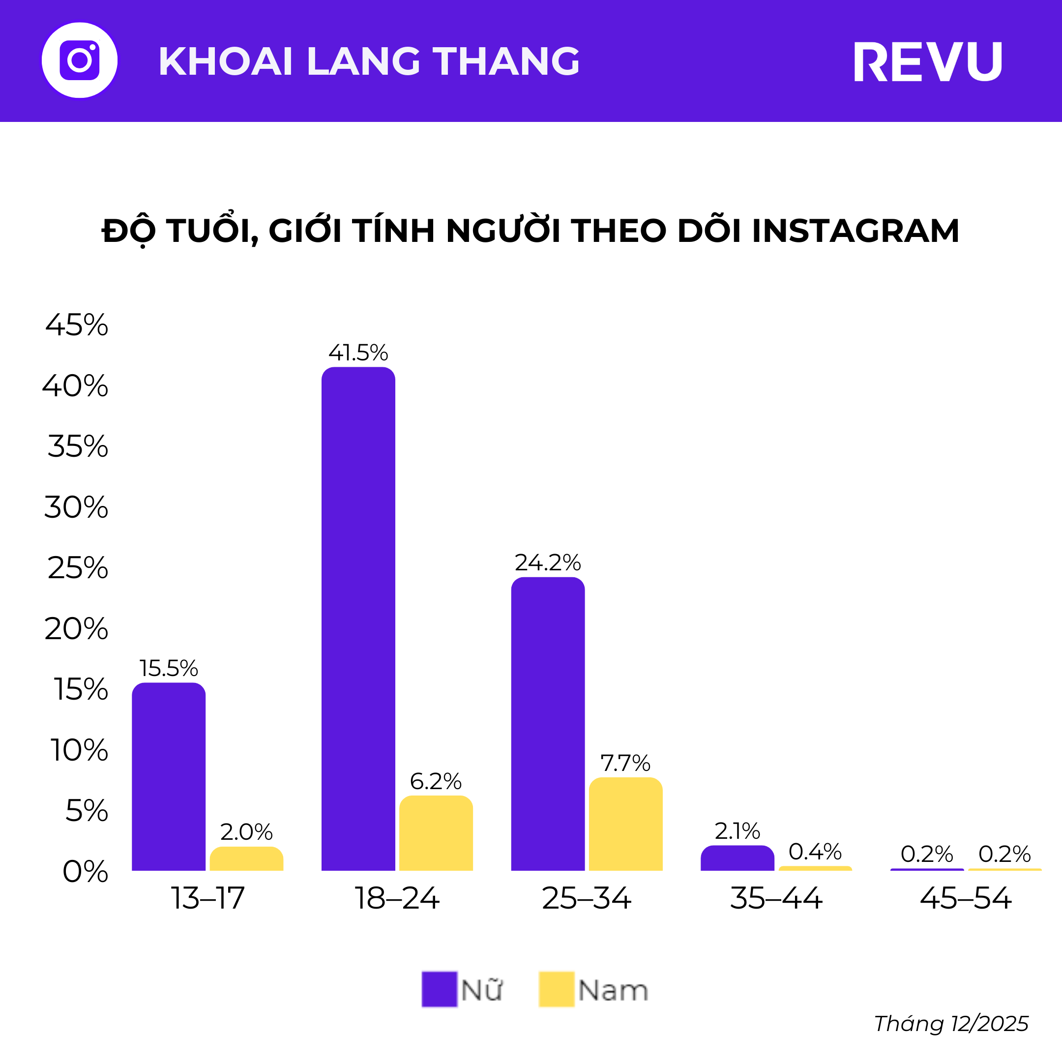 Instagram của Khoai Lang Thang nổi bật với tệp khán giả trẻ, trong đó nhóm tuổi 18–24 chiếm tỷ trọng cao nhất, theo sau là nhóm 25–34. Khán giả nữ chiếm ưu thế rõ rệt, đặc biệt ở nhóm tuổi trẻ, cho thấy Instagram là nền tảng phù hợp để truyền tải những nội dung mang tính cảm xúc, đời sống và phong cách sống.
