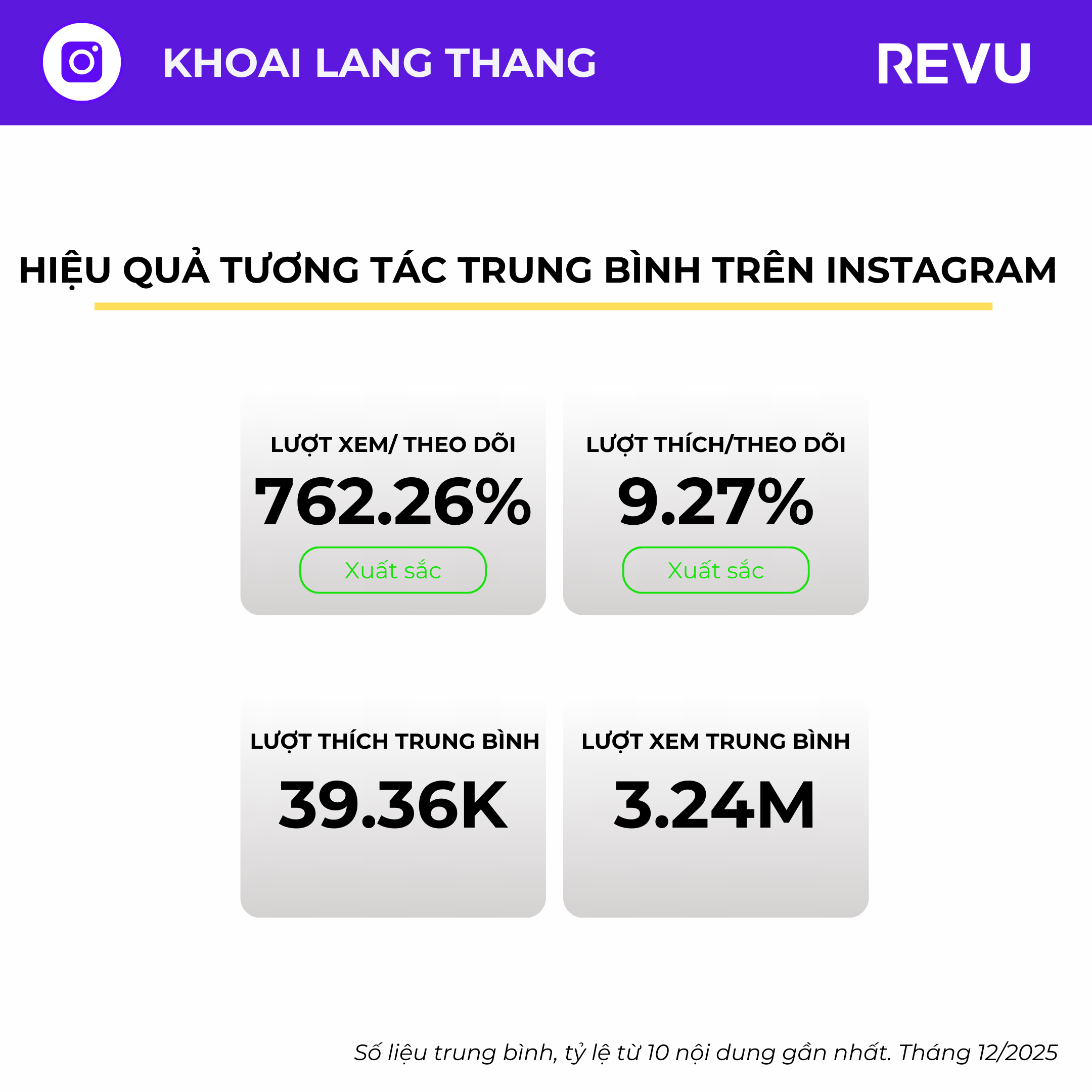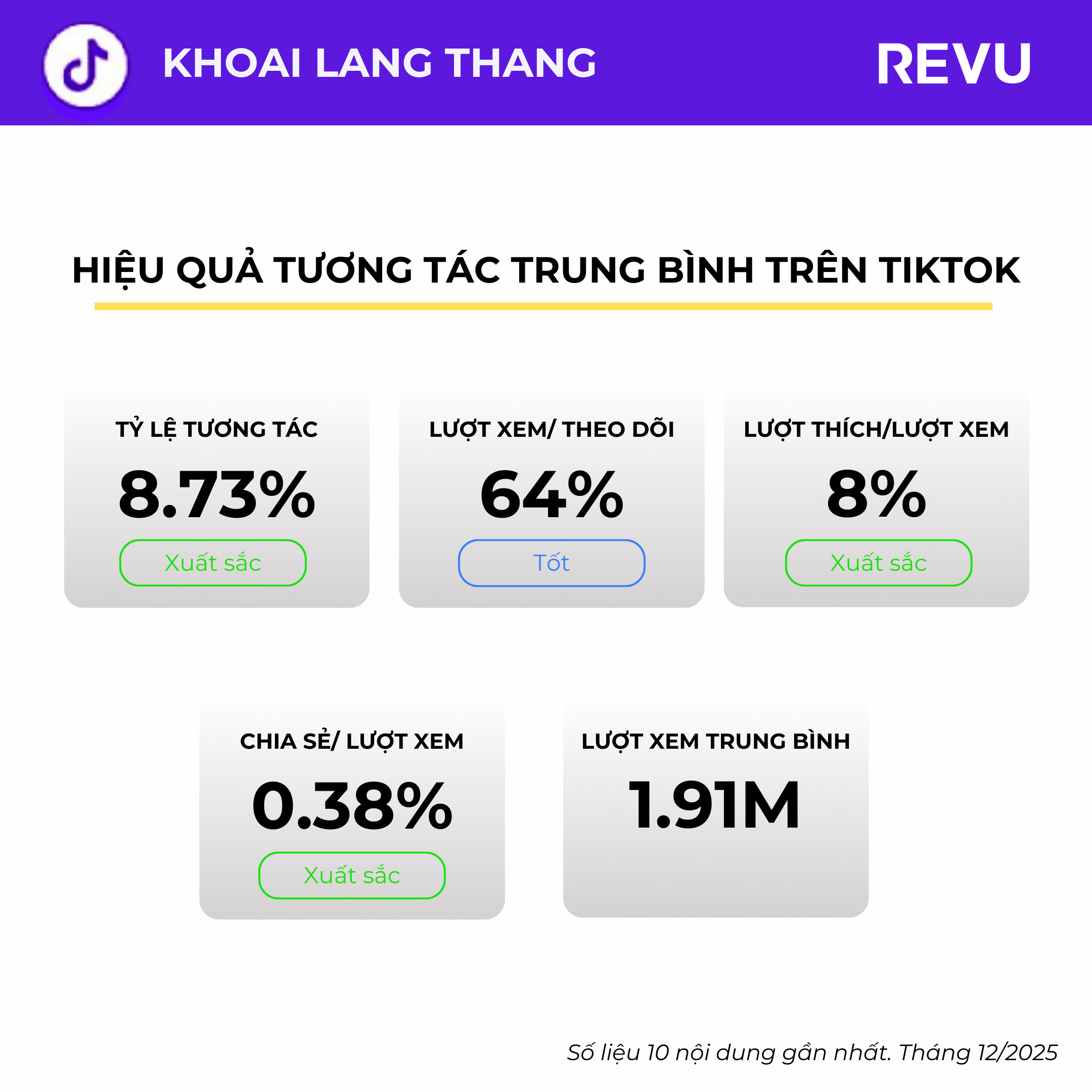 Về hiệu quả nội dung, TikTok ghi nhận tỷ lệ tương tác cao, phản ánh việc người xem không chỉ dừng lại ở hành vi xem mà còn chủ động thả tim, bình luận và chia sẻ. Lượt xem trung bình gần 2 triệu mỗi video cho thấy nội dung của Khoai Lang Thang thường xuyên được thuật toán ưu tiên phân phối, vượt ra ngoài tệp follower hiện hữu. Đây là nền tảng đặc biệt phù hợp cho các chiến dịch cần tạo hiệu ứng lan truyền nhanh, tăng độ phủ thương hiệu và thu hút lượng lớn người xem mới trong thời gian ngắn.