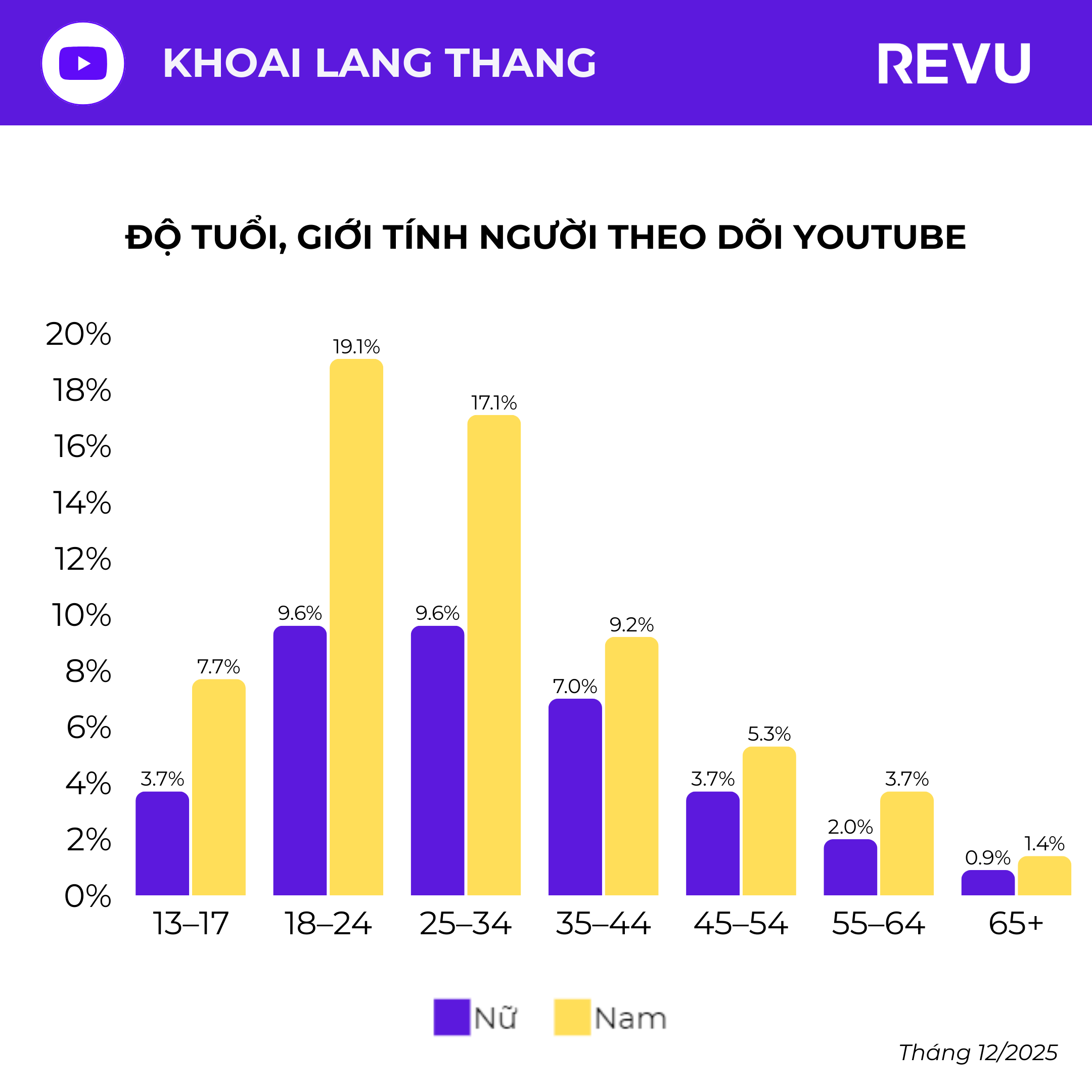 Trên YouTube, Khoai Lang Thang sở hữu tệp khán giả có độ tuổi phân bổ rộng, tập trung nhiều ở nhóm 18–44 tuổi. So với TikTok và Instagram, tỷ lệ khán giả nam trên YouTube cao hơn, phản ánh xu hướng người xem quan tâm đến nội dung dài, có chiều sâu về trải nghiệm, hành trình và câu chuyện.