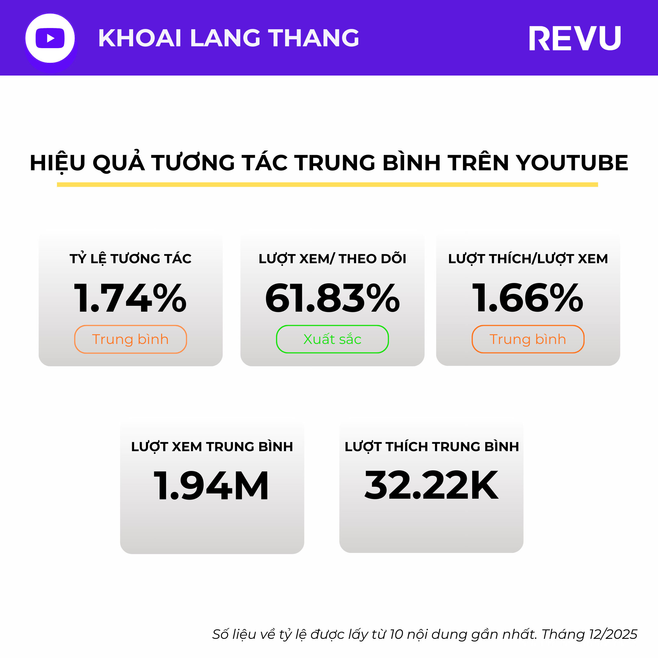 Từ trải nghiệm hợp tác thực tế, REVU đánh giá Khoai Lang Thang là một trong số ít nhà sáng tạo duy trì được phong cách nội dung nhất quán và tinh thần làm nghề nghiêm túc qua nhiều dự án.