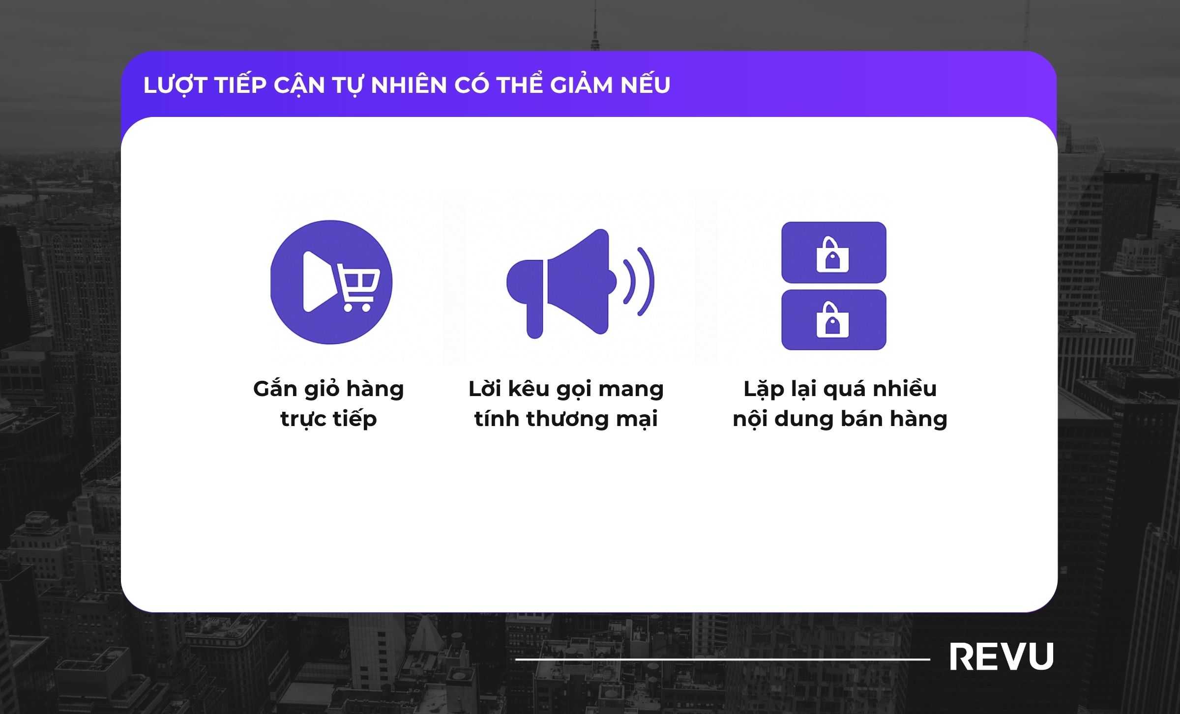 • Nhồi lời kêu gọi hành động trong video organic hoặc lạm dụng mã giảm giá → tụt reach ngay từ đầu.